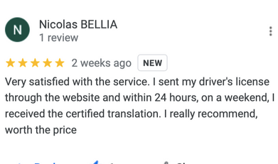 Sie müssen nur die Fotos Ihres Führerscheins (Vorder- und Rückseite) hochladen und Ihre Zahlung leisten. Wir senden Ihnen Ihre Übersetzung als PDF-Datei.